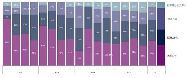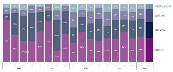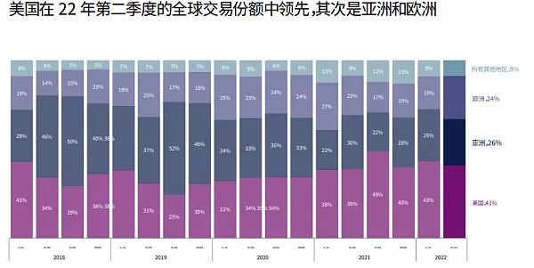 美国在 Web3 全球投资份额中领先,其次是亚洲地区。