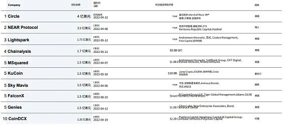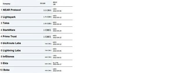 亿级巨额融资减少。1 亿美元以上巨额融资的总额降至 26 亿美元,不到上一季度总额的一半,并且巨额融资轮次数(16 次)也有所下降。这表明由于加密货币市场的「寒冬」和近期价格波动,投资者更加谨慎。