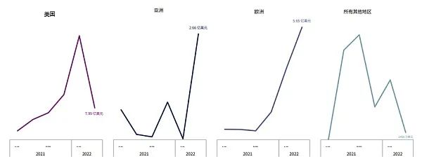 欧洲的 Crypto 投资增长。欧洲是唯一一个 Crypto 风险投资规模增长的地区。它在 2022 年第二季度以 14 亿美元的投资额与亚洲并列,但落后于美国的 34 亿美元。欧洲前 10 大 Crypto 投资中有 6 笔属于 Web3(例如 NEAR Protocol、 Msquared),3 笔属于机构托管加密货币解决方案(例如 Elwood Technologies、 Coinhouse)。