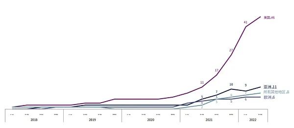 位于美国的独角兽企业数量遥遥领先,其次是亚洲地区。