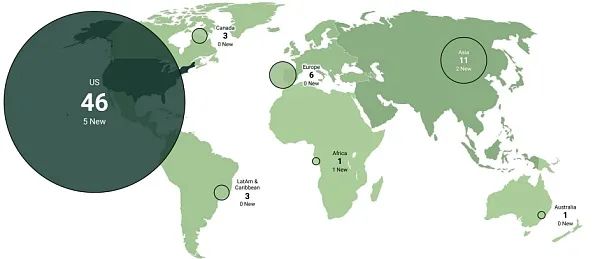 美国拥有 46 家独角兽企业,占总数的 65%,包括 5 家新晋独角兽企业。