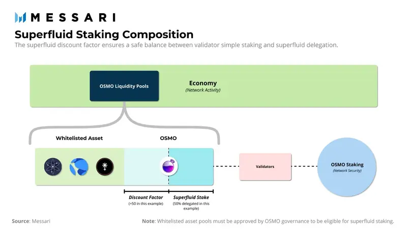 Osmosis 为这个问题设计了一个聪明的解决方案:Superfluid 质押,被认为是流动性质押以来PoS的最大进步之一,这种质押方法允许 LP 使用其原生 OSMO 代币提供流动性,同时使用相同的代币为底层网络带来安全性。下面是 Osmosis Superfluid 质押平台的可视化表示。