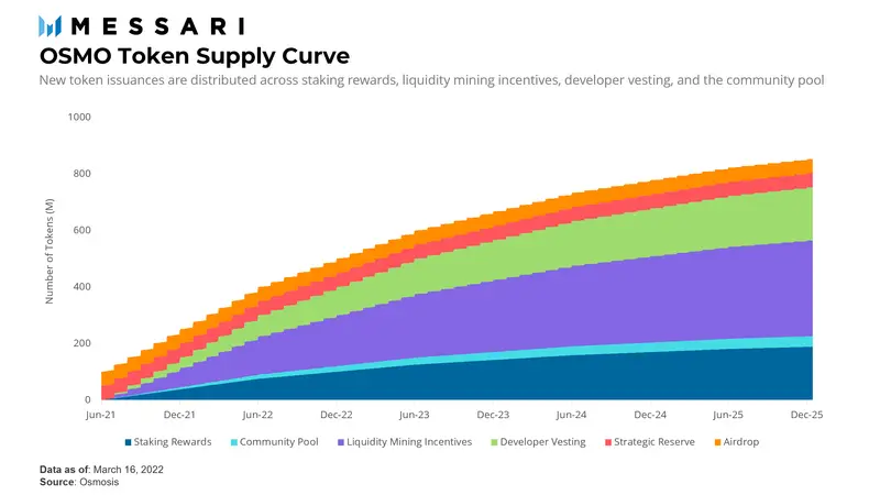 作为原生治理代币,OSMO 支持 Osmosis 应用链的所有功能。在每日基于 epoch 的发行中将设置最多 1 亿枚代币的供应量。释放时间表类似于比特币著名的「减半」,Osmosis 每年将新代币的数量减少三分之一。新的代币将通过质押奖励、开发者归属、社区池分配和流动性挖矿激励发放。完整的供给曲线表如下图所示: