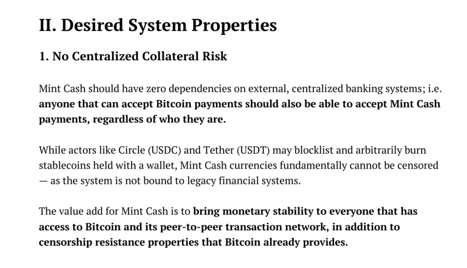 与 USDT 等不同,消除对外部中心化银行系统的依赖,核心原则是确保任何能够接受比特币支付的人都能接受 Mint Cash 支付,不受现有金融系统的限制或审查。