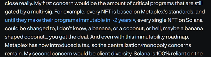 「我的第一个担忧是仍然由多重签名(multi-sig)控制的关键程序的数量。例如,每个 NFT 都基于 Metaplex 的标准,而在它们在未来两年左右(z 年)将其程序变得不可变之前,Solana 上的每个 NFT 都可能被更改为,比如说,一个香蕉,或者一个椰子,或者甚至是一个香蕉形状的椰子... 你明白我的意思。即使有了这种不可变性的规划,Metaplex 现在也引入了一项税收,中心化/垄断的担忧仍然存在。」