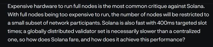 「对 Solana 最常见的批评之一是运行完整节点所需的昂贵硬件。由于运行完整节点的成本较高,节点的数量将受到网络参与者的限制,仅限于少数一小部分。Solana 的目标槽时间为 400 毫秒,而全球分布的验证器集合相对于集中式验证器而言速度较慢,那么 Solana 的表现如何,它是如何实现这样的性能的呢?」
