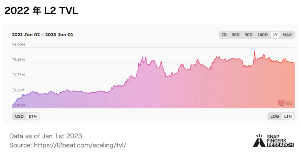 跨到 L2 的资产的美元价值从 57 亿美元下降到 41 亿美元,下降了 28.6%。然而,这可能是由于加密货币价格的下跌,而不是用户资金的撤出,如果以 ETH 计价,则 TVL 从 160 万上升到 340 万,上升了 120.6%。这表明 L2 在 2022 年出现了大量的流动性流入。