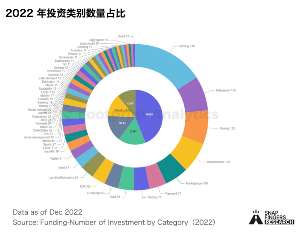 融资方面同样火热。纵观 2022 年,链游的总投资增加了 84%。游戏项目获得了区块链行业总投资笔数的 16%,超过了其他任何种类的投资。元宇宙项目紧随其后排在第二,占区块链融资总额的 7.79%。