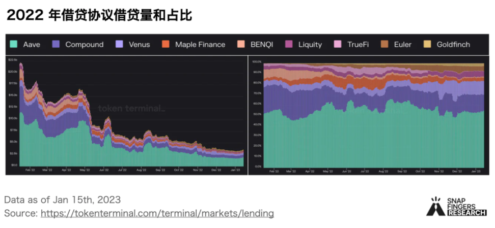 - 2022 年借贷协议借贷总量下降 83%,在 UST 崩溃期间下跌幅度最大。Aave 维持住了市场份额,大约占总借贷量 54%,Compound 占比从 25% 下降至 15%。