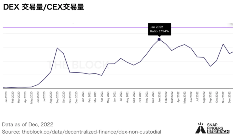 - 链上交易在过去两年经历了爆发性增长,以现货为例,DEX 交易量在 2019 年初仅为 CEX 的 0.12%,到 2022 年 1 月,这一比例最高上涨至 18%。