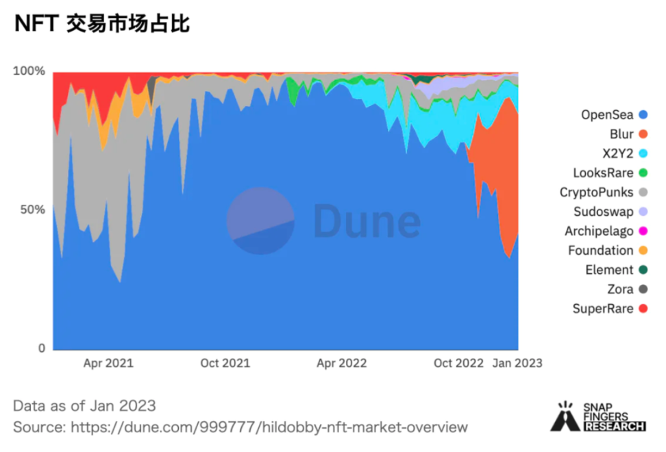2022 年 Opensea 达到 300 亿美元的交易量,保持领先地位。从市场占比来看,在 2022 年初达到 98% 的市场绝对统治之后,其市占率一路下滑,到了 12 月份已经跌至不及 90%。其中年初, LooksRare 和 X2Y2 尝试以流动性挖矿争夺 Opensea 市场,起初效果明显,随着激励减少市场占有率下降明显。去年底 Opensea 占有率明显下降,源于 Blur 的快速崛起。