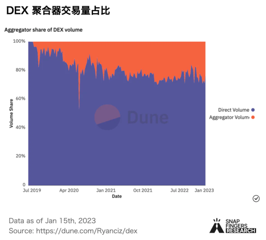 - 聚合器是以用户体验优先的交易平台,代表的是非机器人交易量(超过 70% 的聚合器交易量是由非机器人交易者产生的),代表项目有 1inch, DODO, Matcha, Paraswap, KyberSwap, CowSwap。2022 年 DEX 聚合器交易量占比 15%-30%,仍具有很大的市场空间。