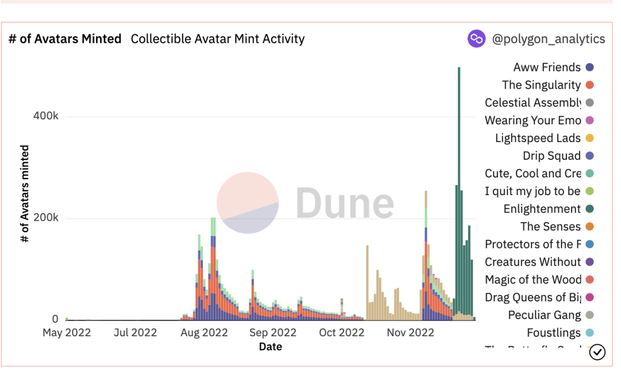 Reddit 一直是加密社区活跃的应用程序之一,今年可以说是它迈入加密步伐最大的一年。今年 1 月,Reddit 开始测试 NFT 头像功能,并于 3 月公布在为其加密团队和 NFT 平台招聘多位工程师。5 月,Reddit 成立 Reddit X,致力于构建区块链等新功能。并于 7 月表示将推出 NFT 头像市场。8 月时向部分用户空投了基于 Polygon 的「收藏头像」(Collectible Avatar)。截止发文,该 NFT 的铸造量已超 676 万枚。