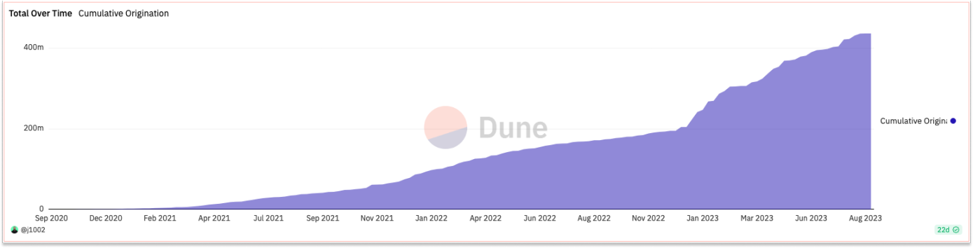 尽管处于熊市, Centrifuge 的累计资金在 2023 年仍增长了一倍多,达到 4.36 亿美元。这对证券化市场总量而言不值一提,但好在增长迅速。