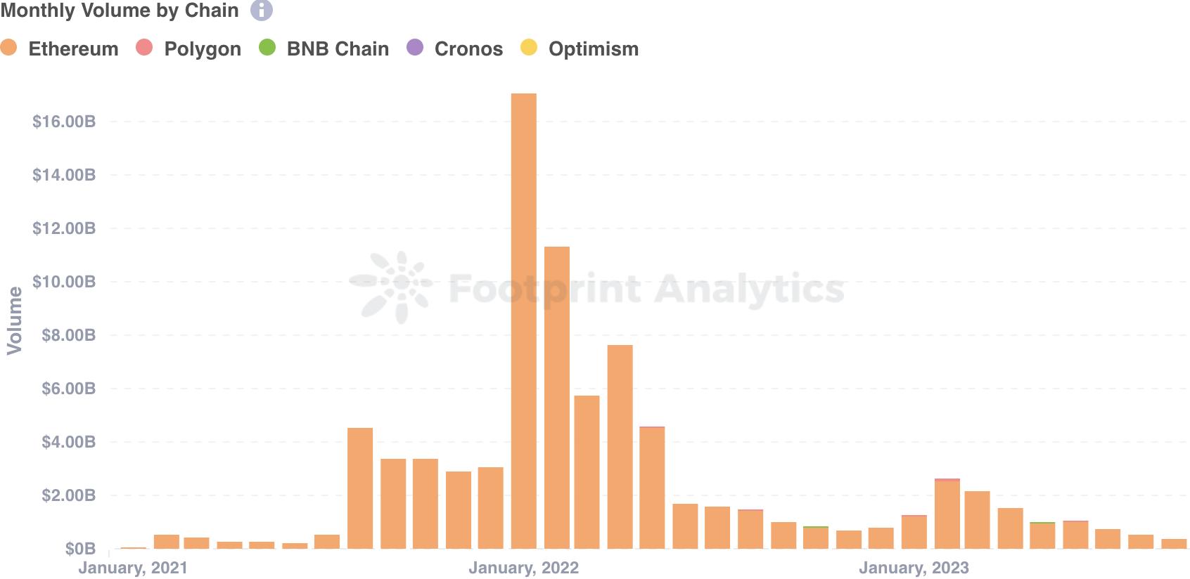 9 月份,以太坊的交易量达到了 3.64 亿美元,占据了 NFT 市场总交易量的 98.1%。然而,与 8 月相比,以太坊的总交易量下降了 30.3%,反映出整个 NFT 市场的下行趋势。