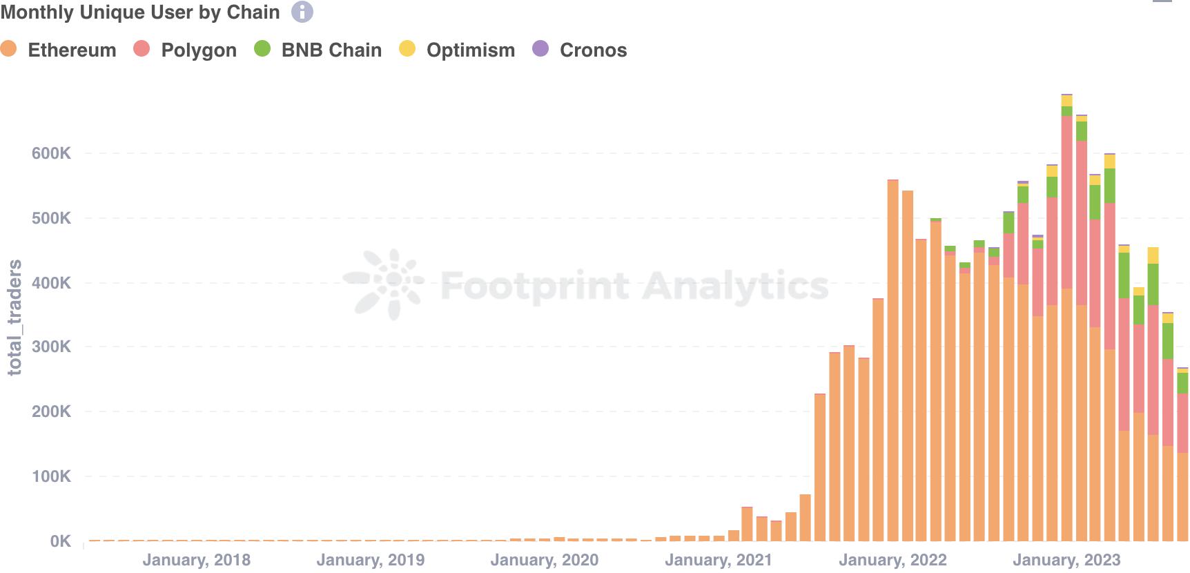 9 月份,每日独立用户的趋势与每日买家/卖家的趋势相似。值得注意的是, 9 月 20 日到 22 日,用户参与度有所增加,主要是与四条区块链上的 Pandra: PixelProwler NFT 相关空投活动有关,其中 Polygon 的用户参与度最为突出。