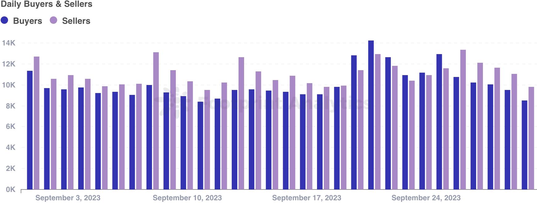 9 月份,NFT 市场的买方/卖方比率为 103.0%,较 8 月份下降了 29.2%。全月共有 14,832 名买家和 143,617 名卖家。值得注意的是,与上月相比,买家人数减少了 30.6%,卖家人数减少了 11.0%。这些数据表明,9 月份 NFT 市场活动放缓,参与的买家和卖家数量减少,市场熊市情绪仍占上风。