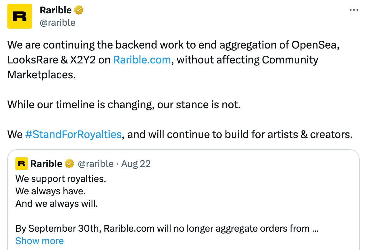 整个 9 月份,NFT 交易市场继续围绕 NFT 版税展开激烈讨论。Rarible 宣布决定在 9 月 30 日之后停止聚合来自 OpenSea、LooksRare 和 X2Y2 的订单。这一举措展示了 Rarible 对版税的支持态度。