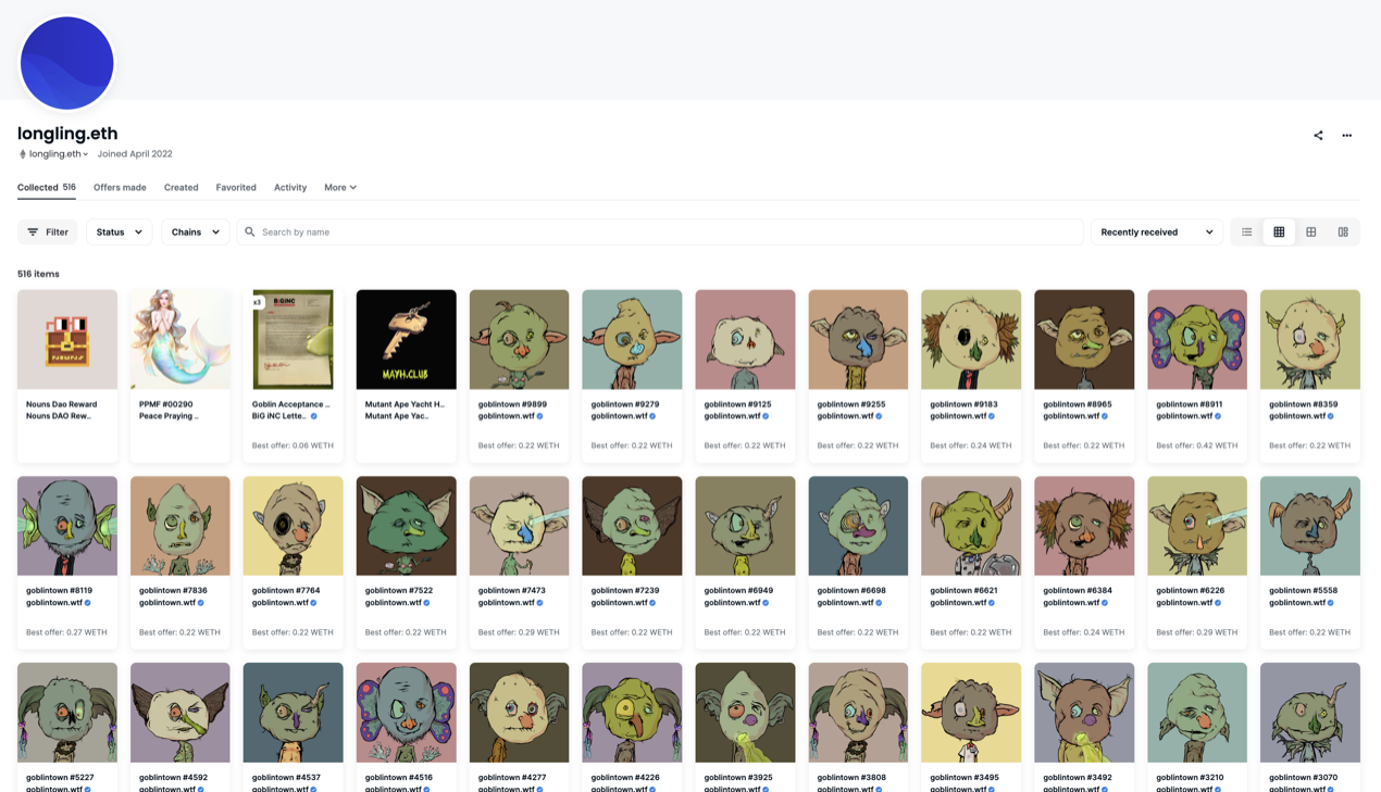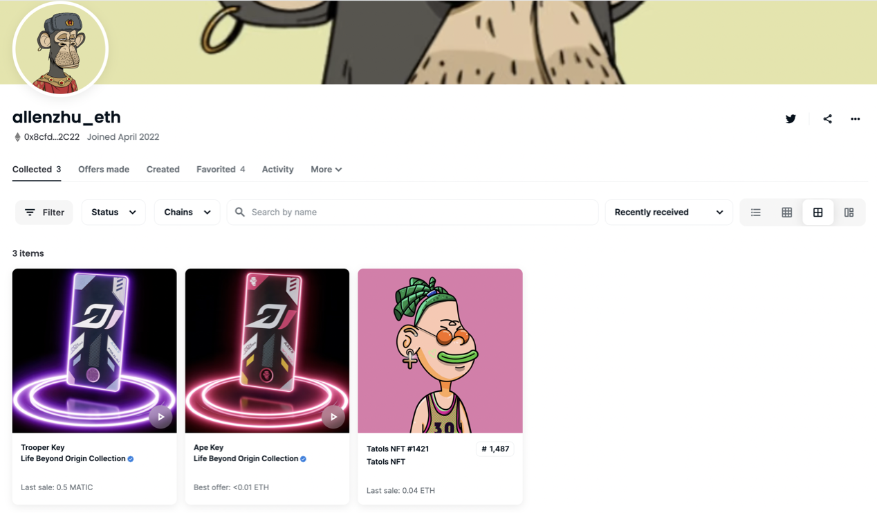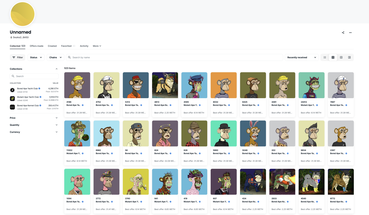 OpenSea显示,BAYC #9279 几经周转,从allenzhu.eth转到了一个甚至没有姓名的钱包账户下。鉴于朱啸虎本人最近po出来的微信朋友圈截图仍然使用BAYC #9279,所以我们仍然认为这枚NFT依旧属于朱啸虎本人的账户。而这个账户一看更不得了,一共持有523个NFT,全部是由其他地址转入,并且全部梭哈BAYC,MAYC和BACK,更是持有187枚无聊猿。