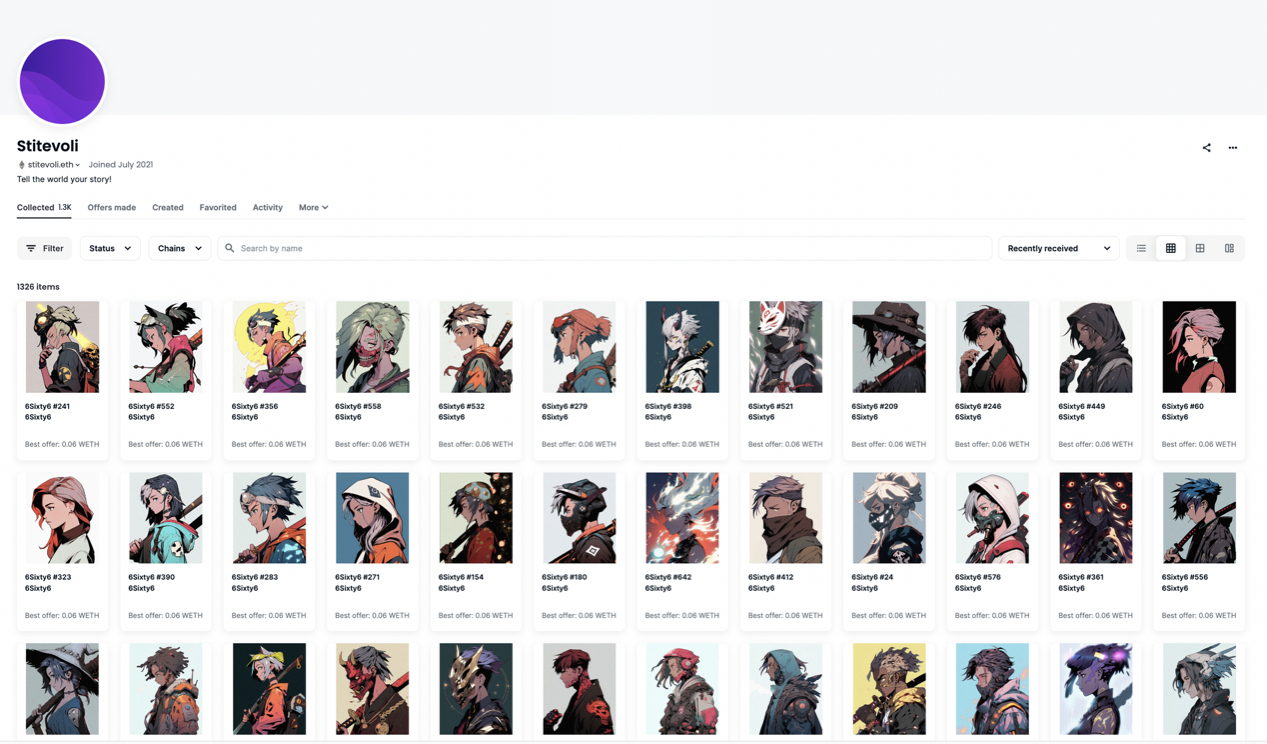 徐静蕾是NFT早期玩家之一。2021年,徐静蕾将自己的Ins 头像更换为Animetas 系列NFT,吃瓜的朋友们迅速从头像扒出了徐静蕾的OpenSea账号,根据其持有记录显示,徐静蕾在2022年就已经拥有400+ 藏品,如今持有量更是有1300多个,藏品包括BAYC,MAYC,DeFi Apes,Azuki,6Sixty6等系列。