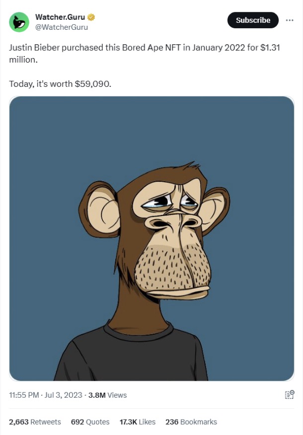 而近日,Justin Bieber 花500ETH(约合131万美元)巨款购于 2022年1月的BAYC #3001 现在价值不到6万美元,浮亏一百余万美元。