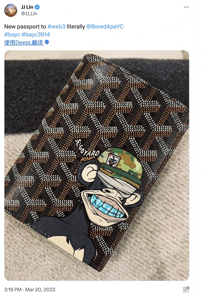 林俊杰就是在“NFT元年”搭上通往Web3列车的名人之一。2022年3月,林俊杰在其twitter发布了一张印有BAYC #3914图案的钱包照片,并发言感谢赠与其NFT的麻吉大哥黄立成。