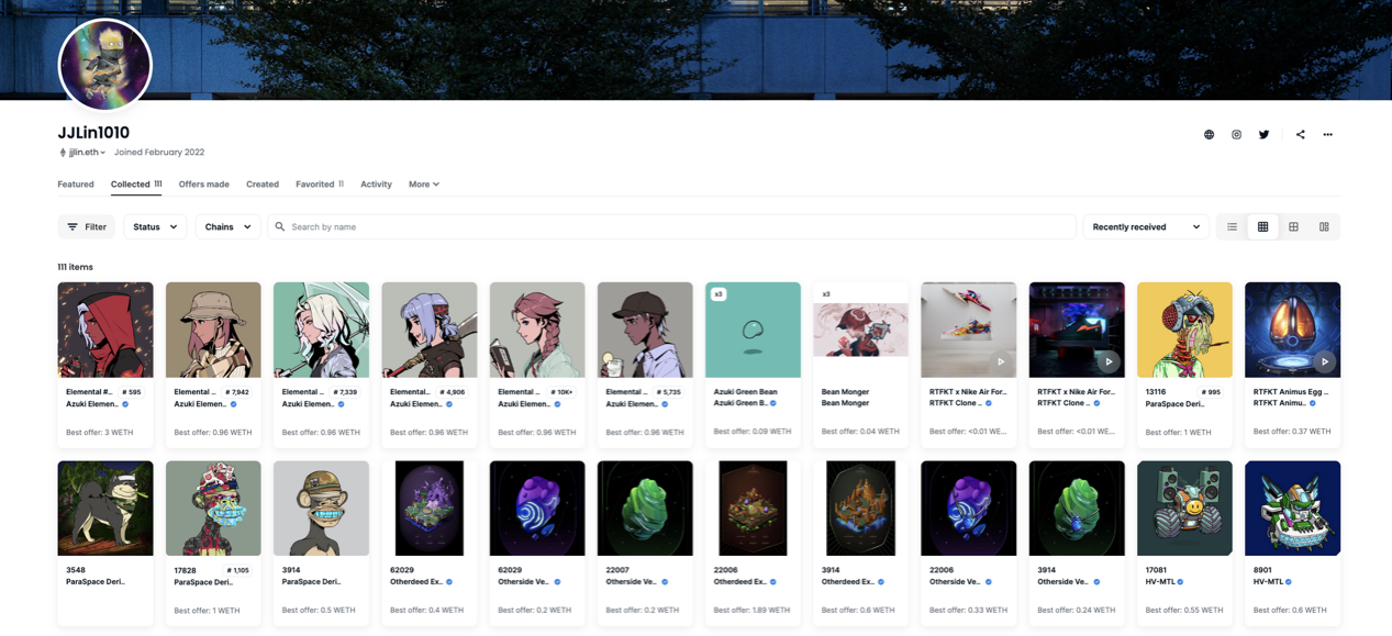 截至目前,林俊杰共拥有111个数字藏品,其中包括 BAYC、CryptoPunks、Azuki、Azuki Elemental 等项目。
