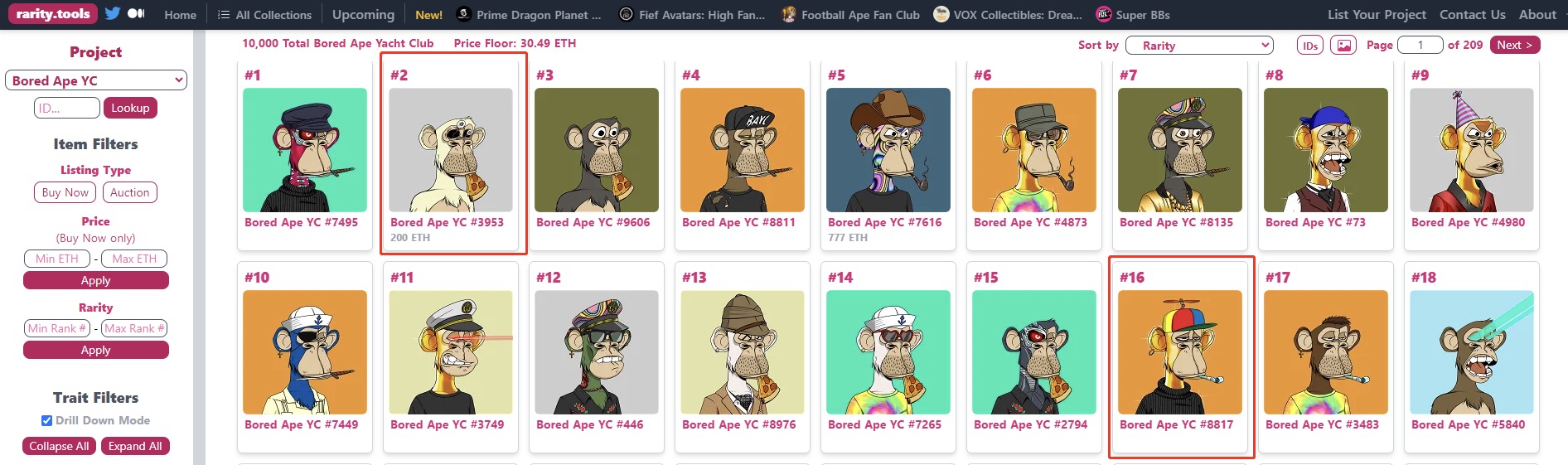 而昨日,稀有度排名第二(据rarity.tools数据)的BAYC #3953 仅以200 ETH(约合37.2万美元)的价格售出,远低于该系列中稀有NFT的巅峰价格。要知道,在2021年10月,稀有度排名16的BAYC #8817在苏富比举行的拍卖会上以 340 万美元的价格成交,成为有史以来成交价最贵的BAYC。