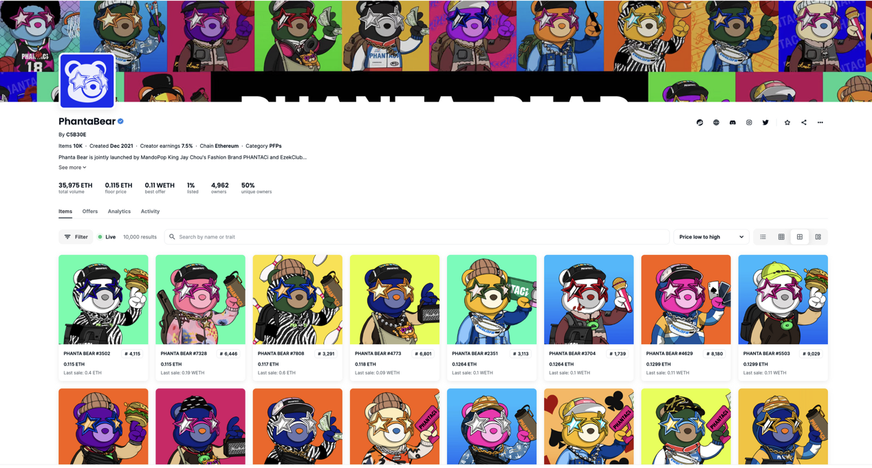 毕竟是“周杰伦的熊”,Phanta Bear上线当天就有4944名持有者,项目总市值在一周后达到顶峰,Phanta Bear 总市值最高点锁定于51999.99 ETH。