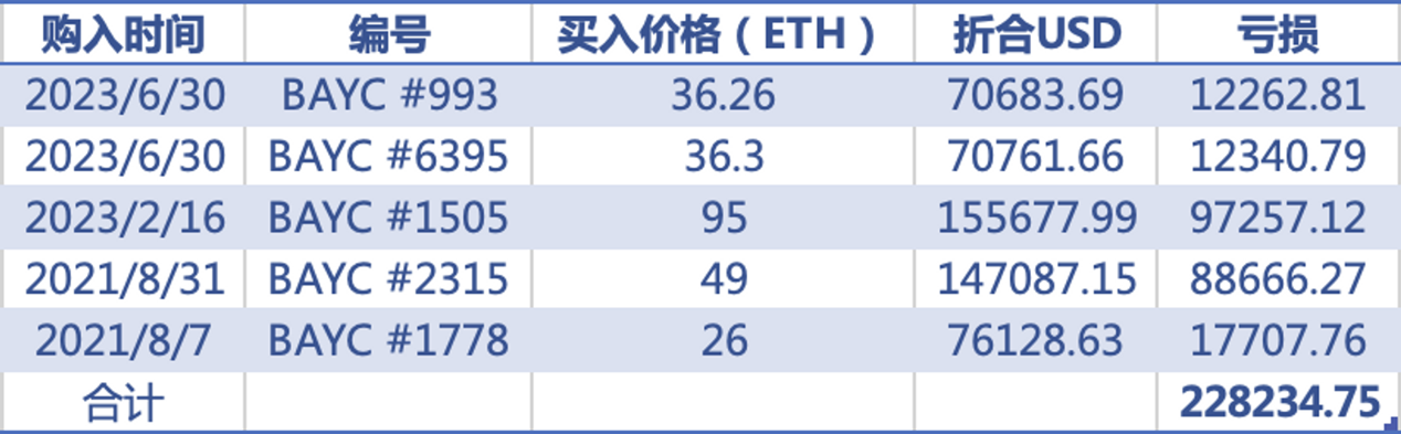 如果只计算BAYC且不考虑转赠情况,徐静蕾本人先后5次购买BAYC。而且从今年2月16日千金一掷,以 95 ETH 高价买入BAYC #1505 来看,似乎徐导纯属看对眼就梭哈型的选手。就目前的市场地板价以及ETH/USD比率来看,仅仅这这五只猴子就让徐静蕾损失了22万美元之多。