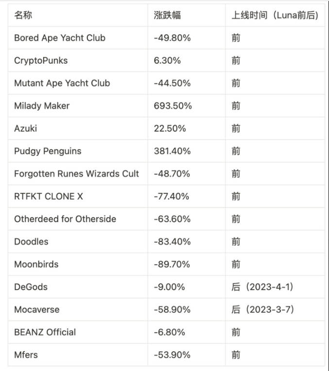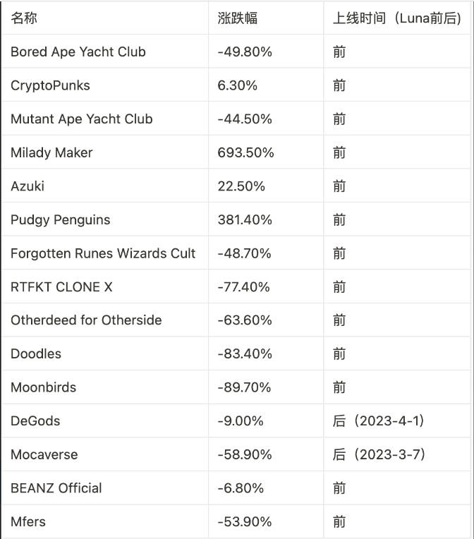 从数据来看 Terra rekt 时间并不是市场上大多数 NFT 价格的最低点,大部分 NFT 价格的低点都徘徊在2023的4月份且从成交量上面来看均有持续下跌的趋势。