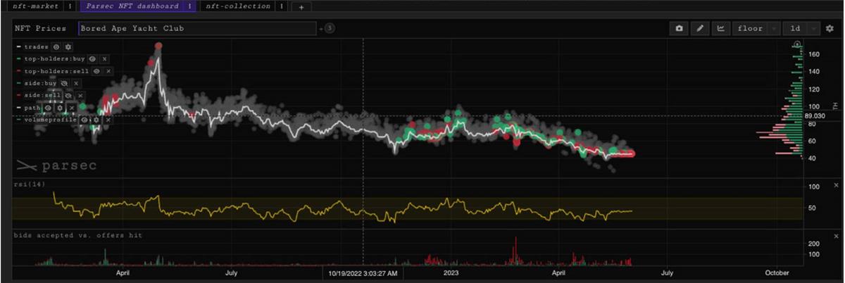 回测一年来的 BAYC 交易量。在今年二月份(02.24)的时候,我们监控到 BAYC 交易量暴增,根据 parsec 数据显示有许多大户出逃的现象。