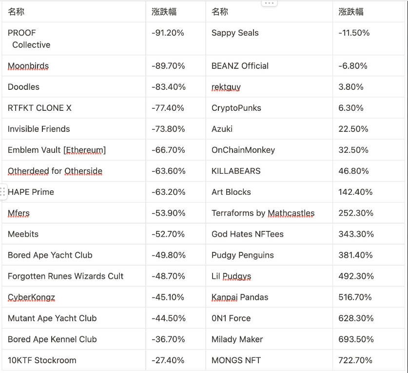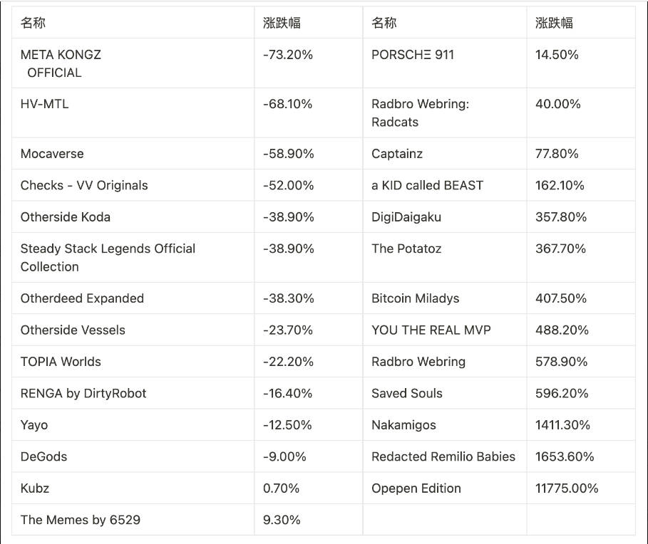 一年内上线的27个项目中,有15个项目价格呈上涨,12个项目走下跌趋势,其中涨幅超过10倍的有 OpepenEdition 、RedactedRemilioBabies 、Nakamigos 。整体来看,新上线的、交易量高的、收益较高的项目比老的 NFT 项目跌幅小。