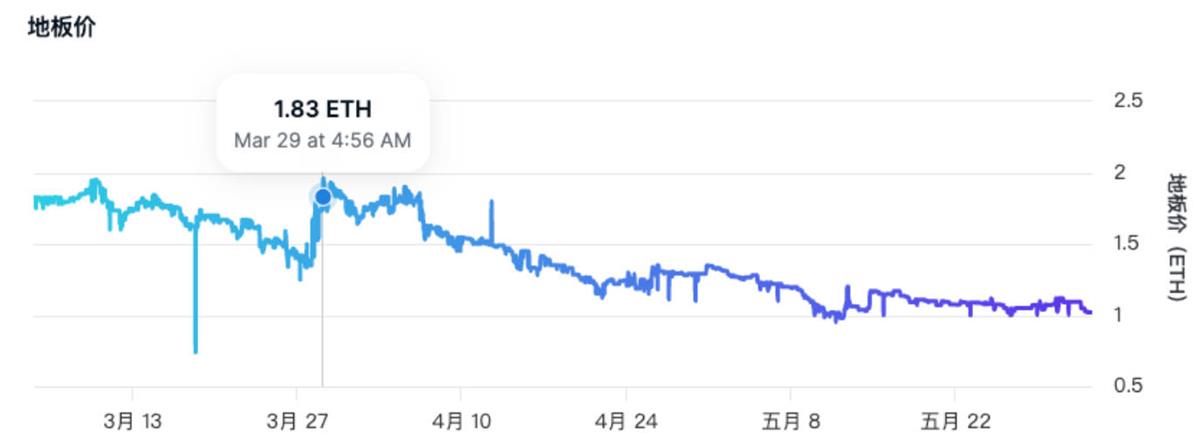 除此之外,Yuga labs生态的NFT系列也进行了进一步膨胀且都没能在价格上有很好的表现,koda在没有被分离出来之前的价格大概是14E左右,土地在元素拆分之前的地板价格是2E。现在这两个系列的地板价格双双腰斩。