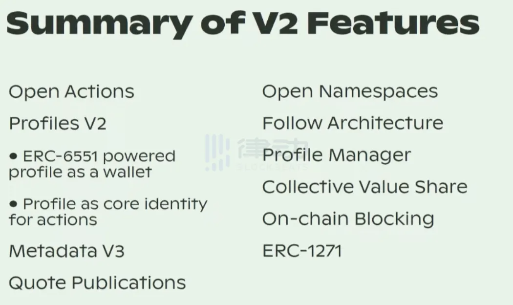 改进了配置文件安全性。LIP-4 引入了配置文件保护器,它提高了配置文件安全性并最大限度地减少了网络钓鱼配置文件接管。V2 还添加了原生引用出版物,促进了更大的参与度,并为整个协议的实施创建了一个简化的标准。它与引用推文相当。V2 增加了链上封锁。被阻止的个人资料不能关注个人资料、评论、镜像、引用、收集或对其内容执行任何打开的操作。可在 Lens 应用程序中强制执行,默认情况下,它们将遵守链上阻止标准。