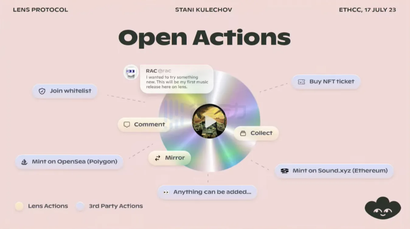 例如,通过 OpenSea「铸币」开放行动,用户只需点击 Lens 帖子上的「铸币」,它就会直接在 Lens 上通过 OpenSea 合约铸造 NFT。应用程序可以与各种第三方市场和协议集成,以便在用户创建的帖子中作为开放操作执行。