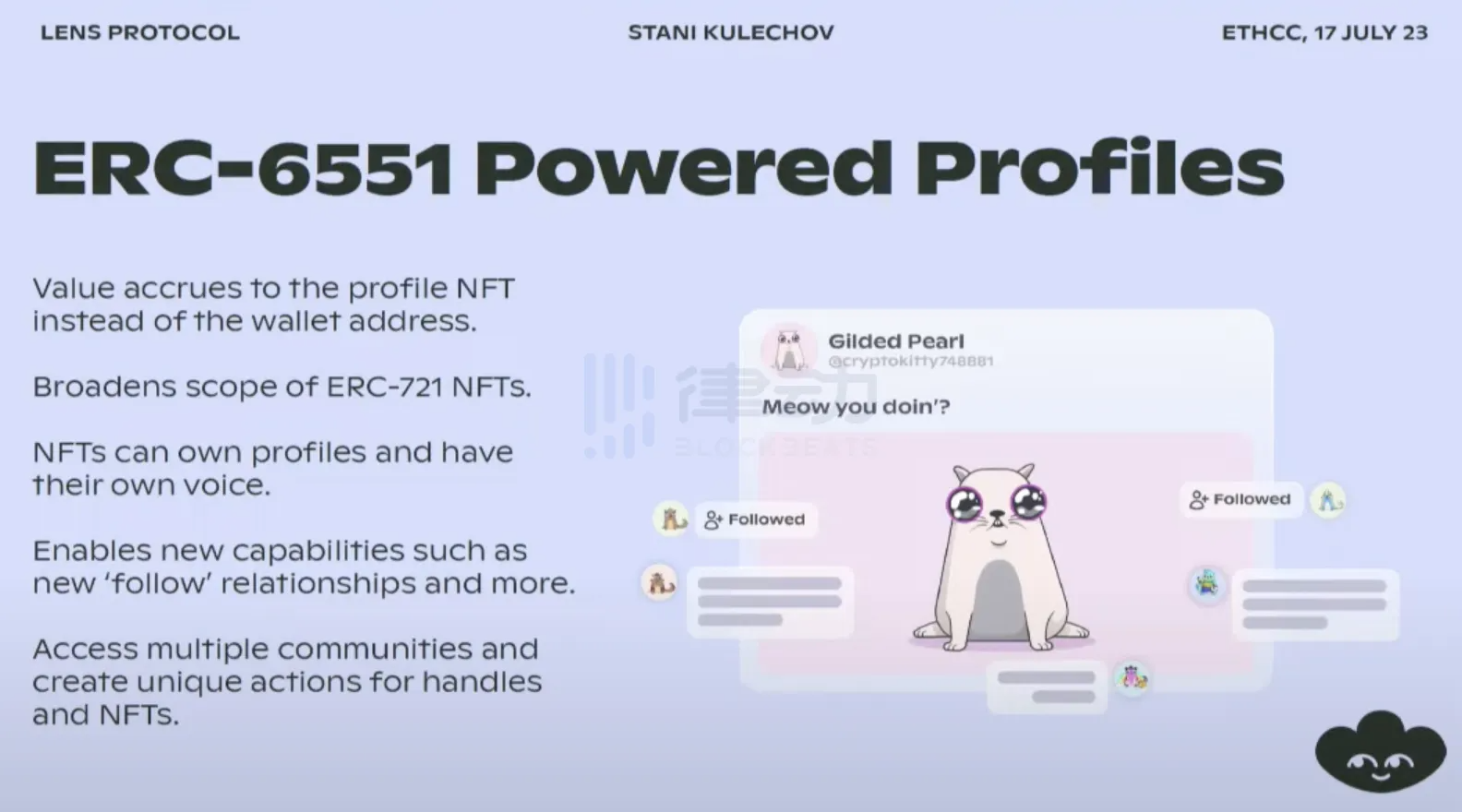 V2 通过在配置文件和 ERC-6551 之间提供支持来展示可组合性的强大功能。为 NFT 提供自己的社交关系、话语权和货币化机会。例如,CryptoKitty 可以拥有 Lens 个人资料,关注其他 CryptoKitties 并发布内容,从而创建自己的价值链。