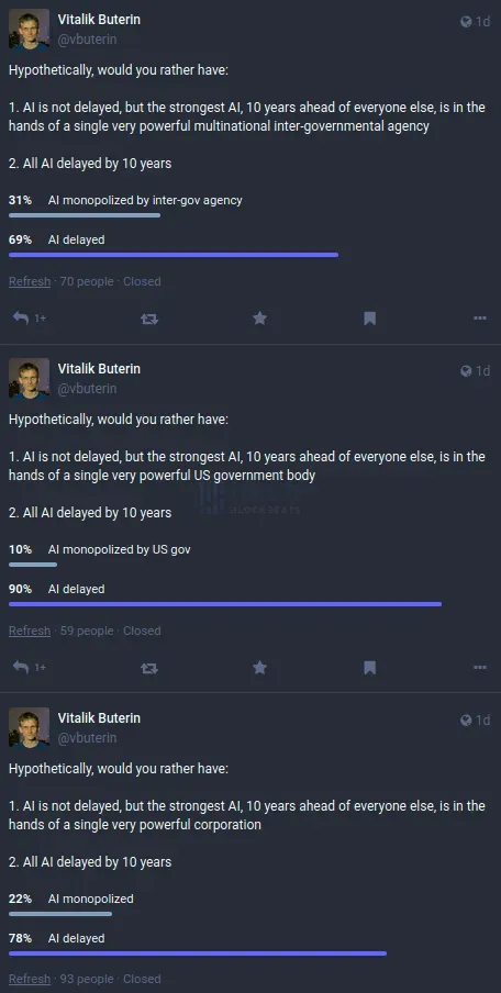 Vitalik Buterin 在他的文章中进行的最新调查表明,许多人担心出现垄断版本的 AI,因此倾向于延迟其进展。