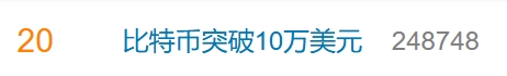 萌币网 消息,「比特币突破 10 万美元」词条上升至微博热搜榜第 20 位。