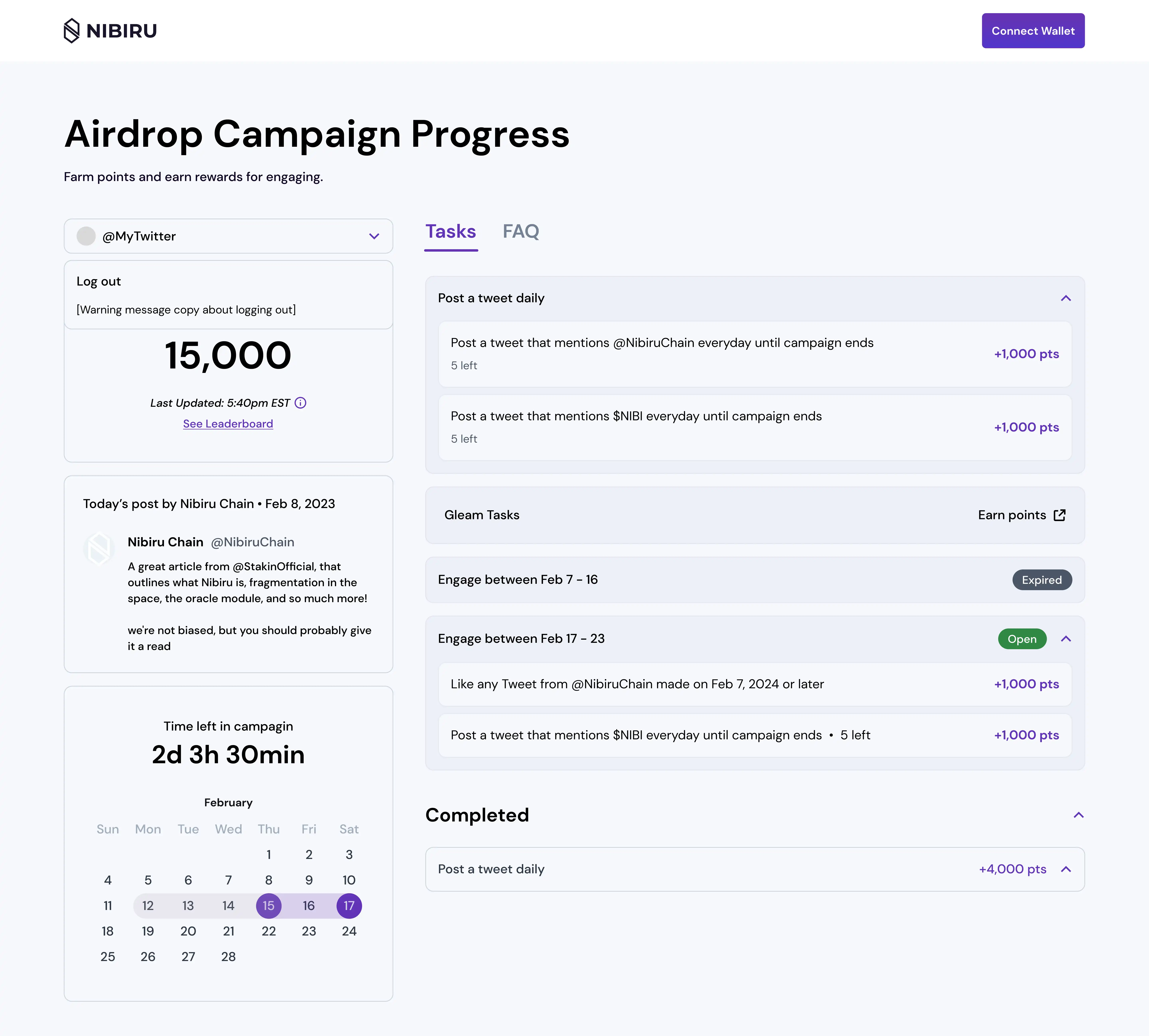 · 从您的 X 账户发推文提到 @NibiruChain 或 $NIBI,或者更好的是,两者都提到。这种互动允许您每天赚取积分!但请记住,积分仅归属于您发帖的当天。