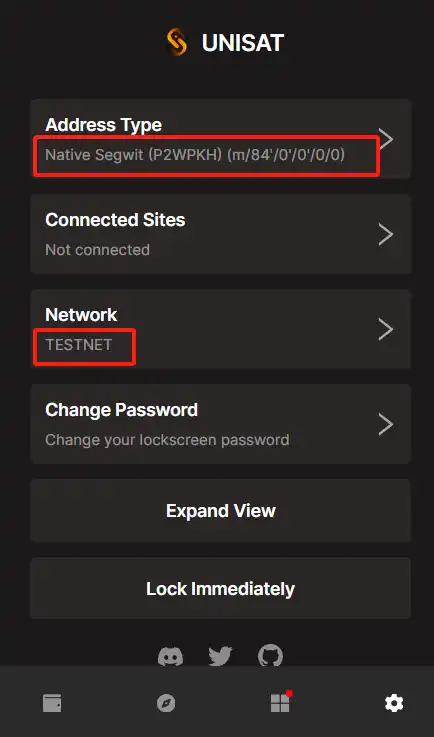 对于在比特币测试网上的操作,官方推荐使用 UniSat 钱包来获取测试 BTC 和进行后续的跨链功能交互。在 UniSat 的设置中,您需要将网络配置为 TESTNET,并选择地址类型为 Native Segwit,以便为您的钱包地址设置。