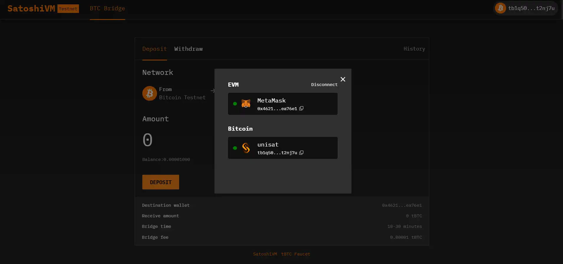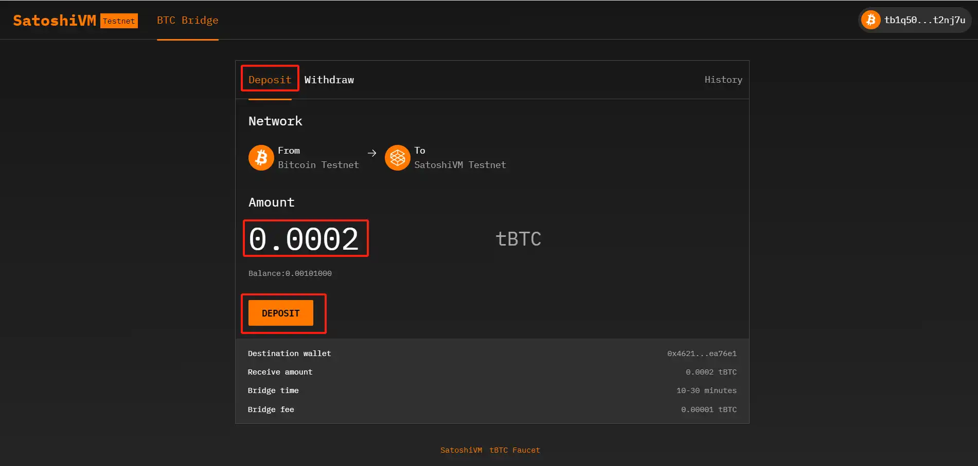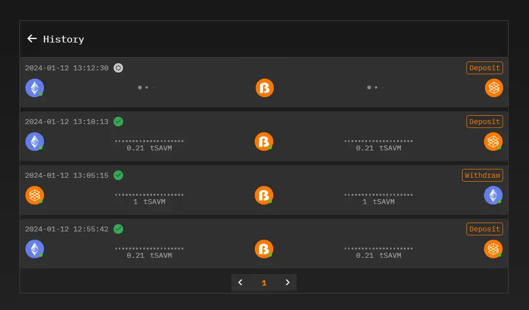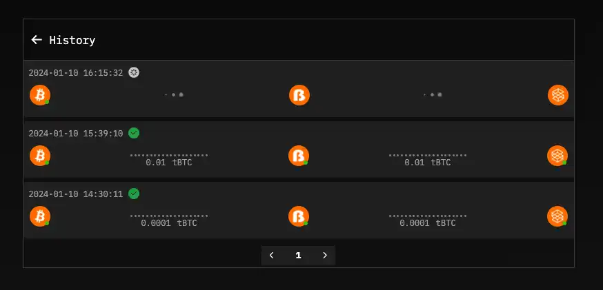 监控交易进度: 一旦存款开始,在 SatoshiVM Bridge 的「历史记录」页面上监控您的交易进度。该页面提供有关您的存款状态的实时更新。