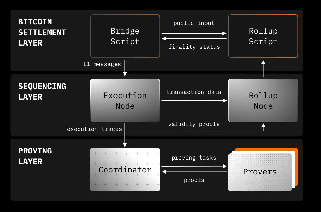排序层: 本层由一个协调器组成,它负责将证明任务分配给证明者,并将生成的证明传递给 Rollup 节点,以便在比特币上完成验证。它还包括一个证明者池,负责生成验证 L2 交易正确性的有效性证明。