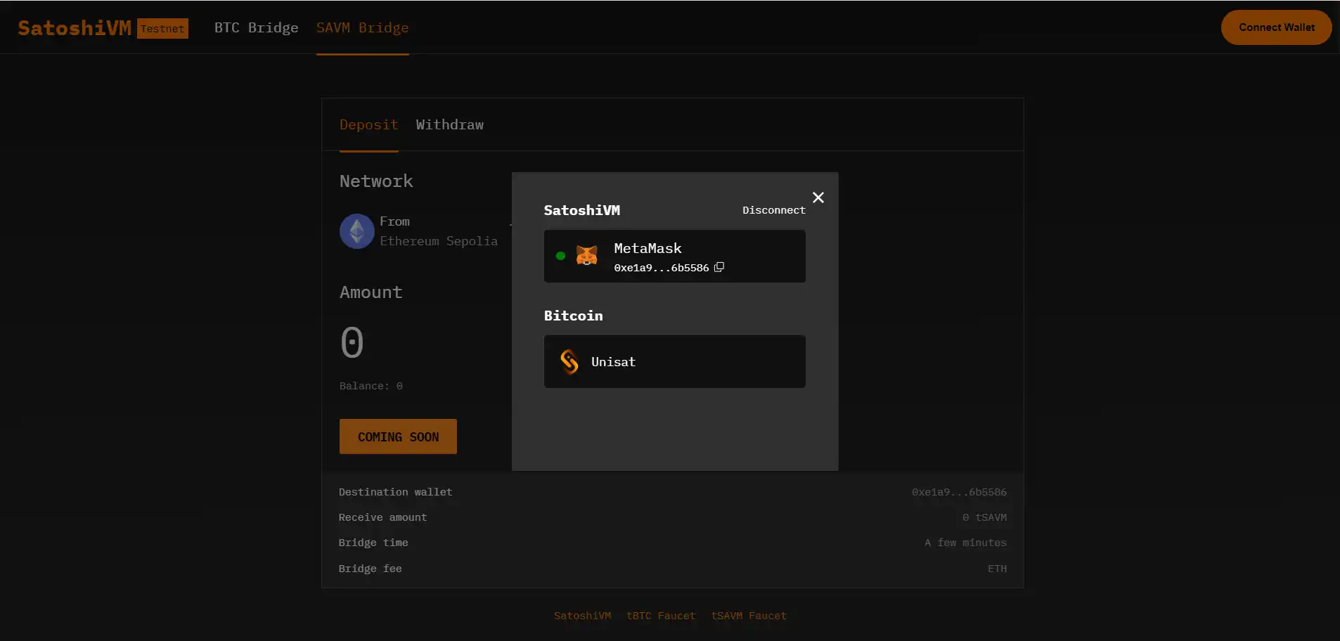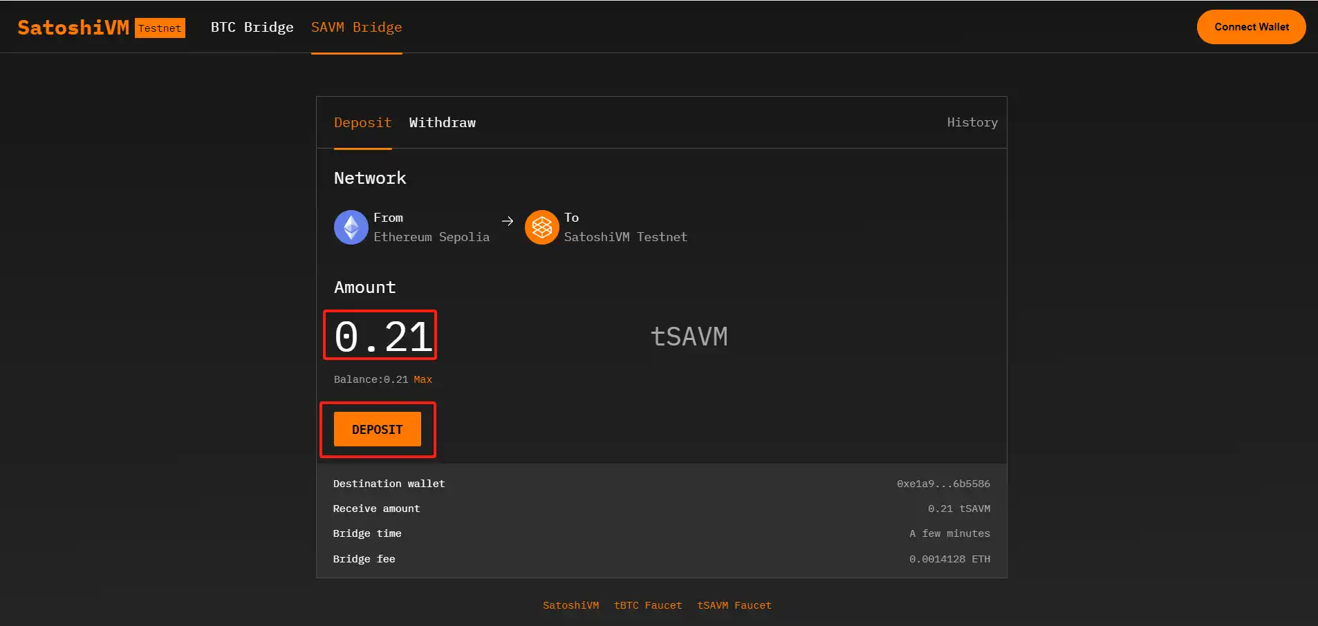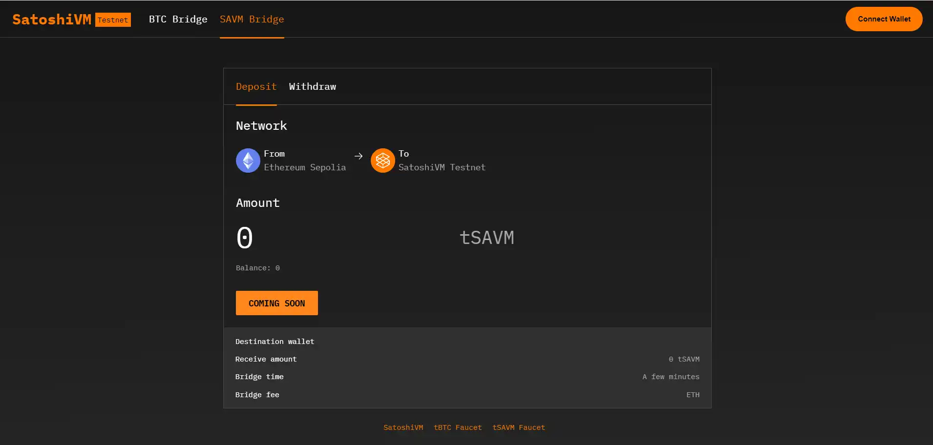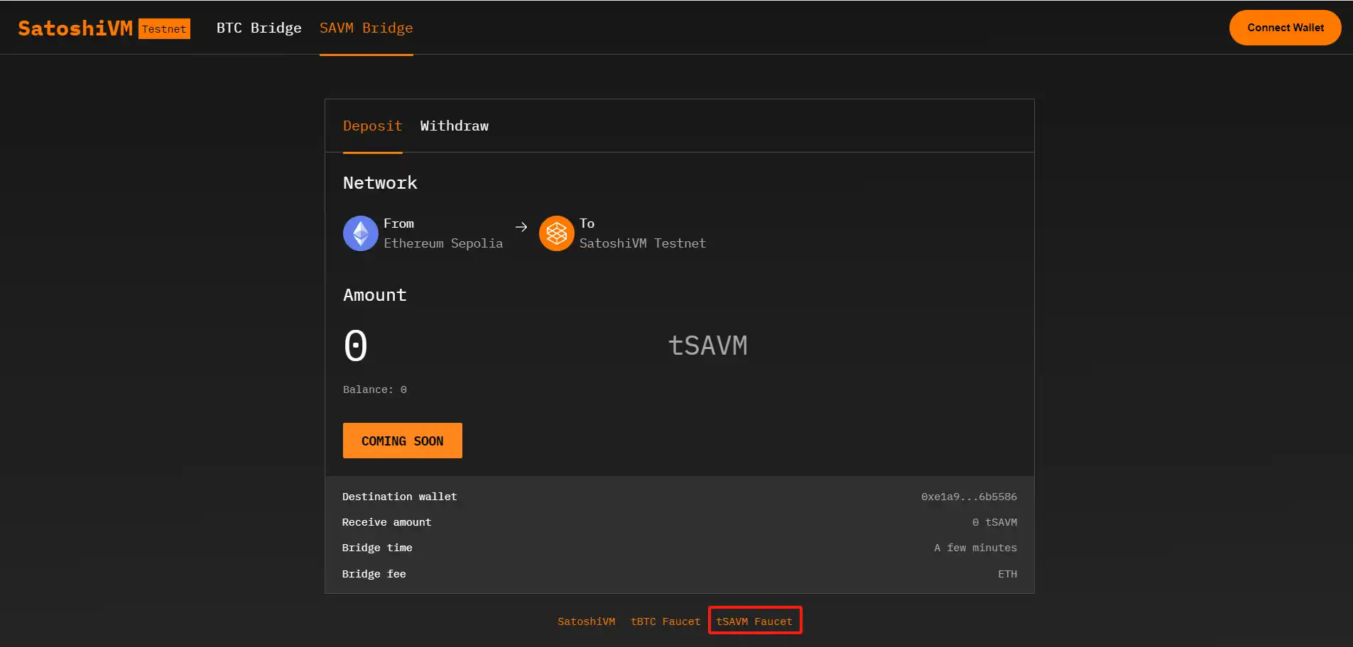 导航到官方 SAVM Bridge: 访问官方SAVM Bridge page页面,开始将 SAVM 从以太坊 Sepolia 转移到 SatoshiVM 测试网的过程。