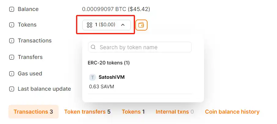 通过 Explorer 检查 SAVM 余额,存款完成后,同样可以在 SatoshiVM Explorer上检查收款地址的 SAVM 代币余额,确保交易已正确完成。