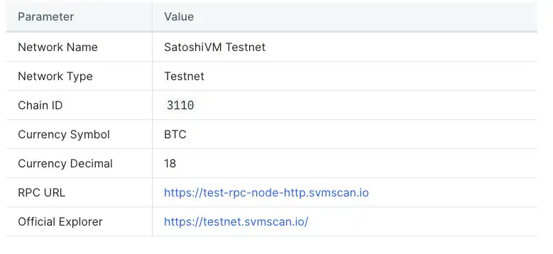 MetaMask 已经自动添加了以太坊 Sepolia 网络的配置信息。而 SatoshiVM Testnet 的配置信息如下:网络名称为 SatoshiVM Testnet,网络类型为 Testnet,链 ID 为 3110,货币符号为 BTC,货币十进制为 18,RPC 网址为 https://test-rpc-node-http.svmscan.io,官方浏览器地址为 https://testnet.svmscan.io/。主网网络的详细信息将在正式启动后公布。