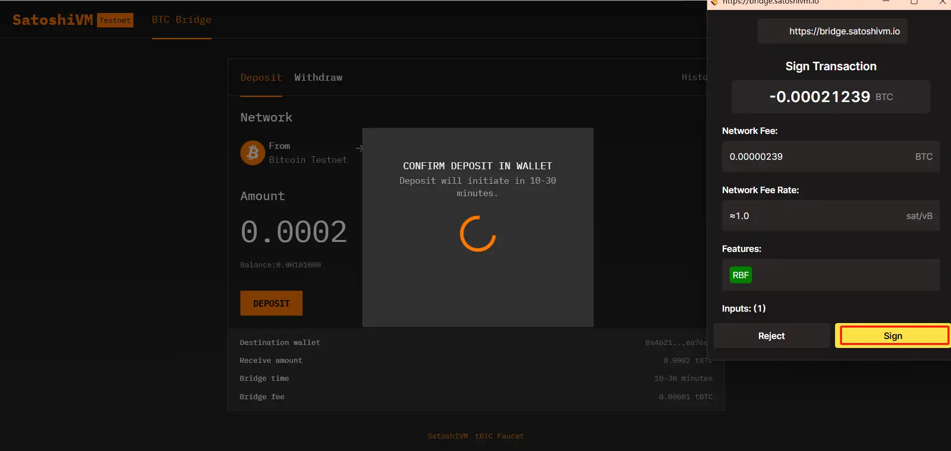 为了实现与 SatoshiVM 的无缝交互,需要使用官方的 BTC 桥接功能,将 BTC 从比特币转移到 SatoshiVM。