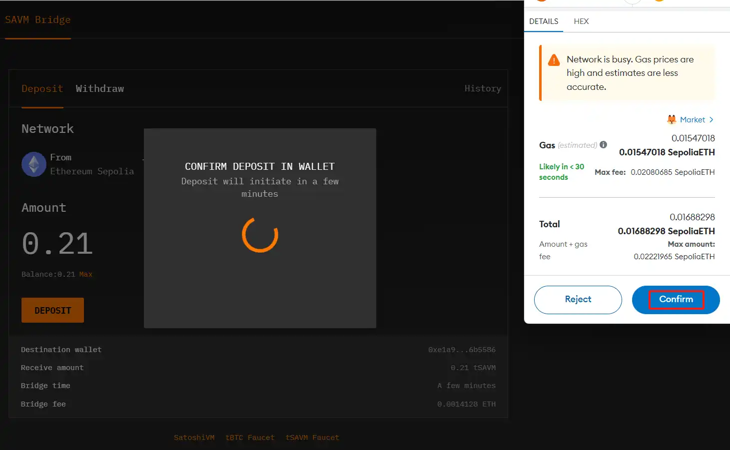 在 MetaMask 中确认充值交易: 确认在 MetaMask 中的存款交易。