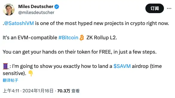 SatoshiVM 值得关注的另一个原因是,其投资人 Miles Deutscher 在社交媒体明示了,完成测试网交互将会得到 SatoshiVM 的空投代币$SAVM。BlockBeats整理了相关教程。