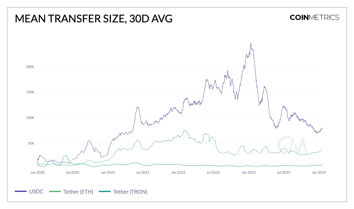 为了更好地理解使用模式和Tether为哪些人提供服务,研究“典型” Tether 交易的性质是有见地的。数据显示,USDT的平均转账金额通常小于USDC的平均转账金额,后者目前平均每笔交易约为75000美元。这更高的平均值表明,USDC通常用于较大规模的交易,这与其作为主要境内(指美国)稳定币的地位及其在 DeFi 应用中的广泛使用相一致。